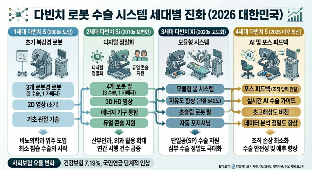 2026년 현재는 5세대 모델인 다빈치 5 시스템이 현장에 투입되고 있습니다. 5세대 시스템은 단순히 시각 정보에만 의존하던 기존의 한계를 넘어 조직의 저항력을 의사의 손으로 직접 전달하는 포스 피드백 기술을 구현했습니다. 이는 수술 중 발생할 수 있는 의도치 않은 조직 손상을 방지하고 수술의 안전성을 극대화하는 혁신적인 진보로 평가받고 있습니다.