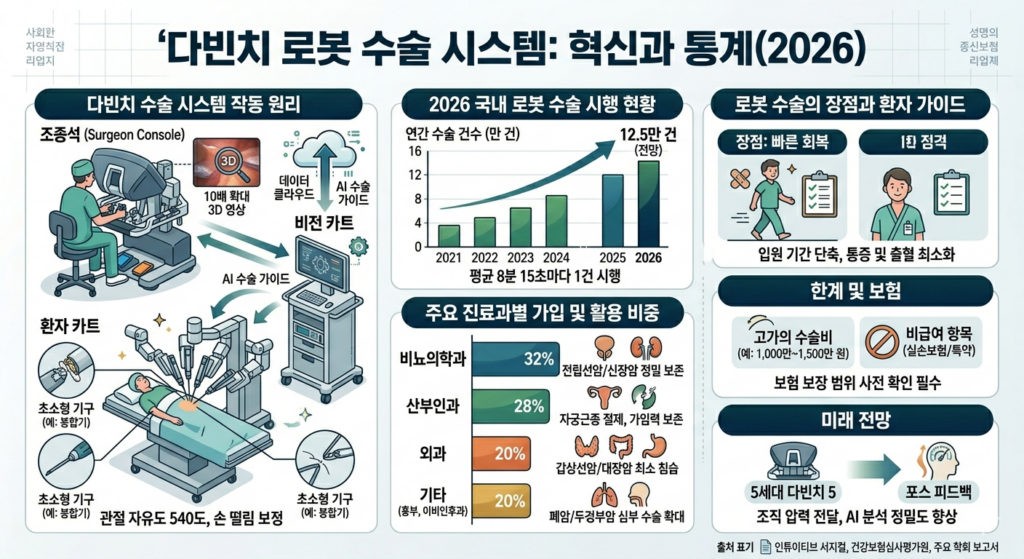 다빈치 로봇 수술의 기술적 메커니즘과 국내외 시행 통계, 그리고 최신 의료 트렌드를 심층 분석한 보고서입니다. 본 내용은 인튜이티브 서지컬의 최신 지표와 건강보험심사평가원, 그리고 주요 의료 통계 자료를 바탕으로 작성되었습니다.
