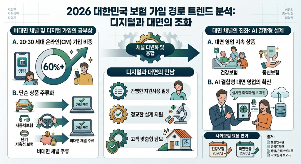 반면 복잡한 설계가 필요한 건강보험이나 종신보험은 여전히 설계사를 통한 대면 채널 비중이 높습니다. 다만 최근에는 인공지능(AI) 설계 보조 도구를 활용하여 고객에게 최적화된 담보를 실시간으로 제안하는 디지털 결합형 대면 영업이 확산되고 있습니다.
