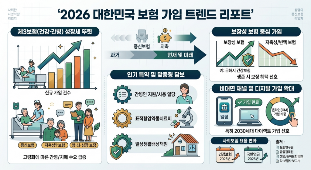 2026년 보험 시장의 가입 통계와 주요 트렌드를 분석한 상세 보고서입니다. 본 내용은 보험연구원, 금융감독원 및 주요 보험사의 2026년 상반기 시장 전망 보고서를 바탕으로 작성되었습니다.