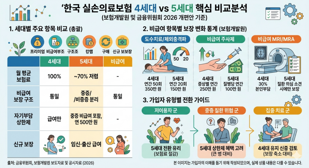 특히 5세대는 의료 쇼핑을 방지하기 위해 비급여 보장 구조를 이원화했습니다. 이는 꼭 필요한 치료를 받는 사람들에게 혜택이 집중되도록 하는 구조적 변화입니다.